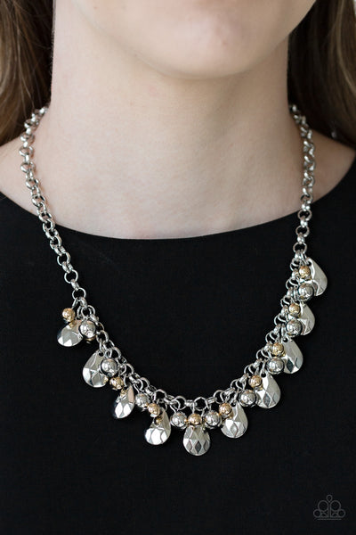 A collection of shiny silver and glistening gold beads join faceted silver teardrops along the bottom of a bold silver chain, creating an edgy fringe below the collar. Features an adjustable clasp closure.
